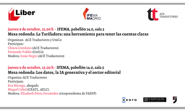 Como en ocasiones previas, ACE Traductores participará en la edición de Liber de 2025, que este año se celebra en Madrid (IFEMA, Av. Partenón, 5, pabellón 14.1), con dos actividades el jueves 9 de octubre: