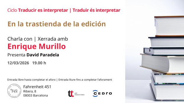 El jueves 12 de marzo tendrá lugar en Barcelona la charla «En la trastienda de la edición», de la mano de Enrique Murillo y nuestro socio David Paradela. Esta actividad se engloba en el marco del ciclo «Traducir es interpretar | Traduir és interpretar», organizado por ACE Traductores en colaboración con CEDRO, y será en la librería Fahrenheit 451 a las 19.00 h, con entrada libre hasta completar el aforo.